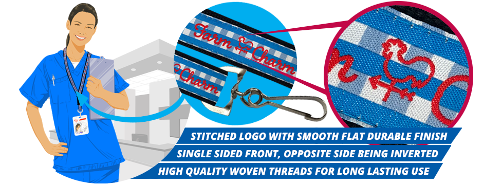 One-sided woven polyester lanyards. Standard attachments: J-Hook, Lobster Claw, Bulldog Clip, Split Key Ring or Cell Phone Loop.