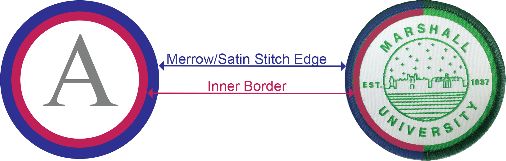 Woven and Sublimated patches with merrow or satin edge that include a solid colored inner border.